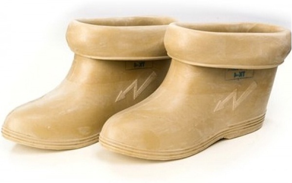 В качестве верхнего покрытия качественная эластичная резина, особенный состав которой придает ей свойства диэлектрика и тканевая подкладка внутри - при изготовлении такой обуви исключается возможность использования металлических деталей, синтетических утеплителей и других вставок, проводящих ток.